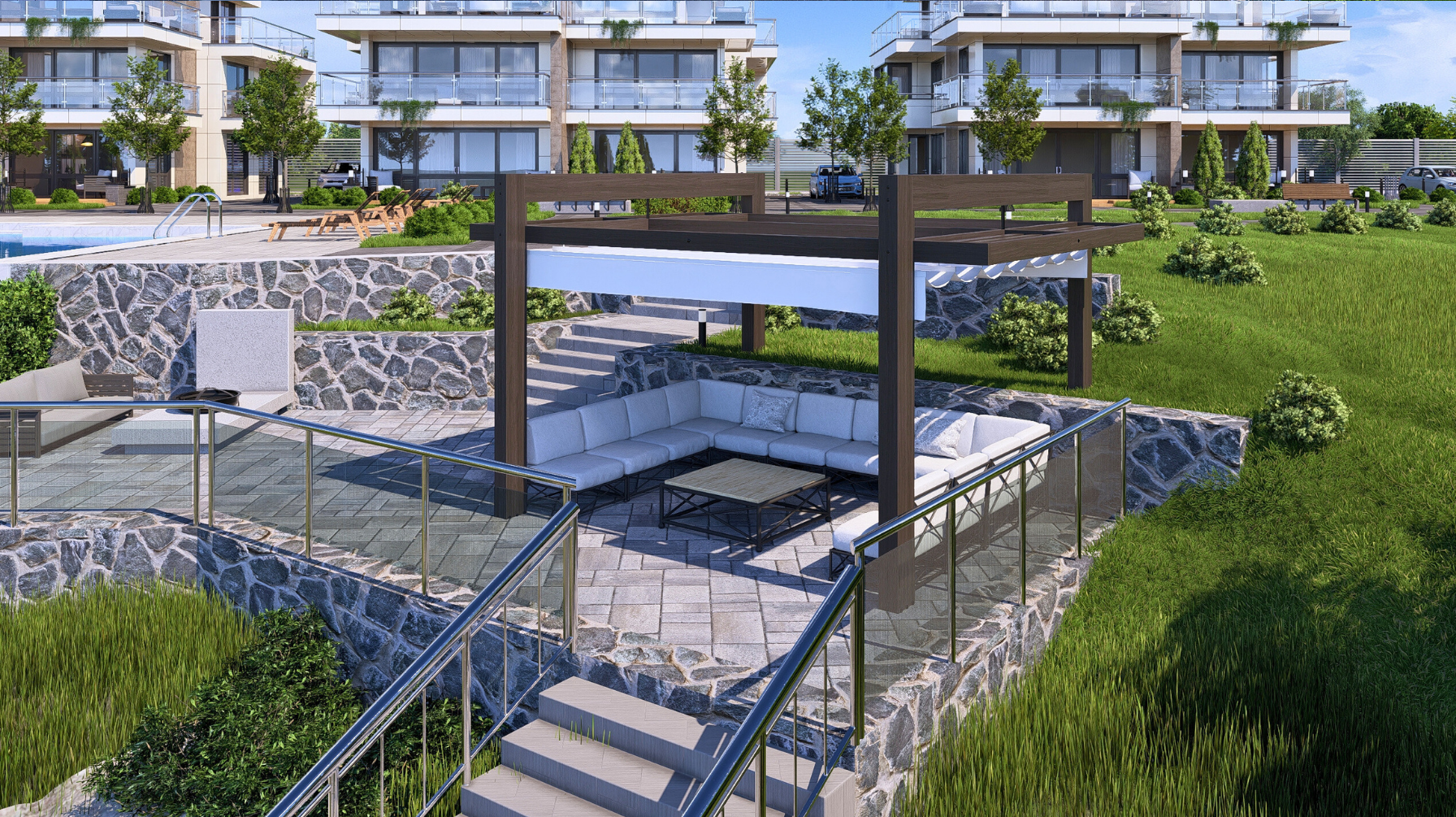 There is a swimming pool, parking lot and children's playground on the territory. There is a private descent to the sea.